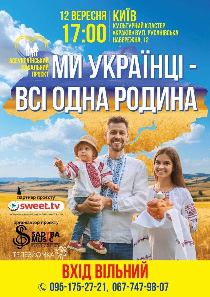 Захід Всеукраїнського соціального проєкту «Ми українці — всі одна родина» від SWEET.TV і «Садиба Мьюзік» Національний онлайн-кінотеатр SWEET.TV та агенція івентів «Садиба Мьюзік» запрошують всіх бажаючих на захід, який об’єднує родини та українців.