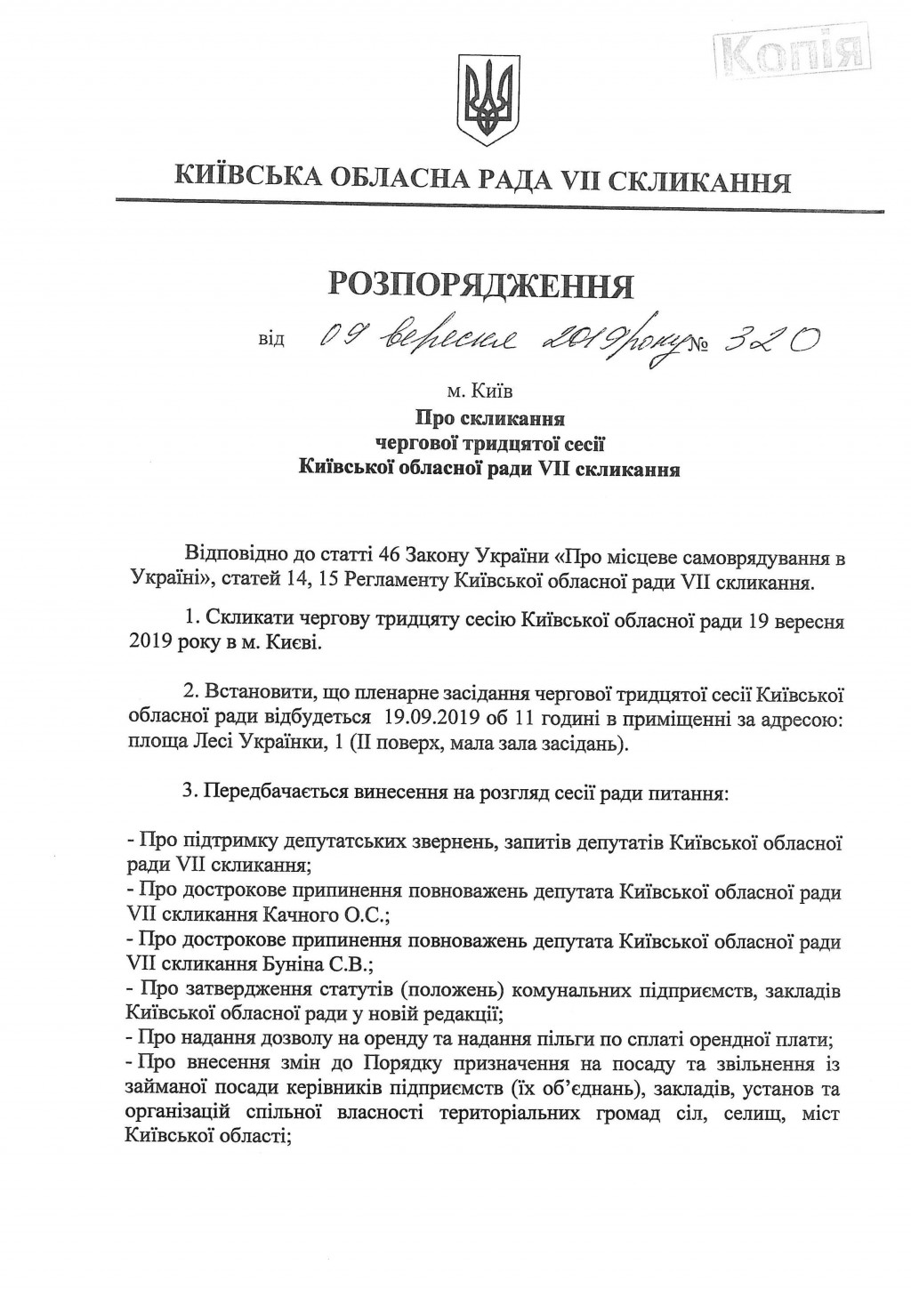 Відповідне розпорядження №320 від 09.09.2019 року підписав голова облради Микола Стариченко