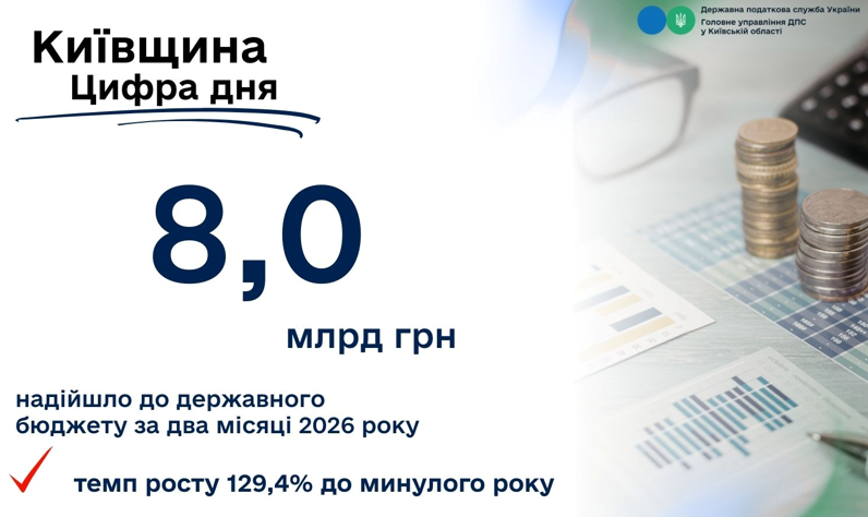 Січень–лютий 2026 року для Київщини завершилися фінансовим результатом — майже 8 млрд грн до державного бюджету. Виконано доведені показники доходів.