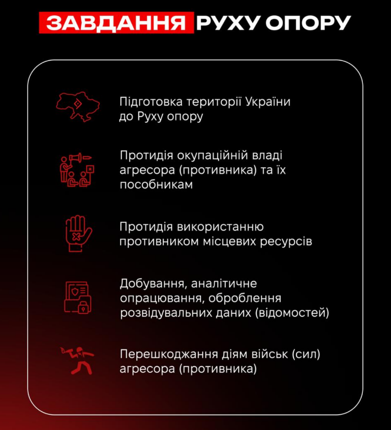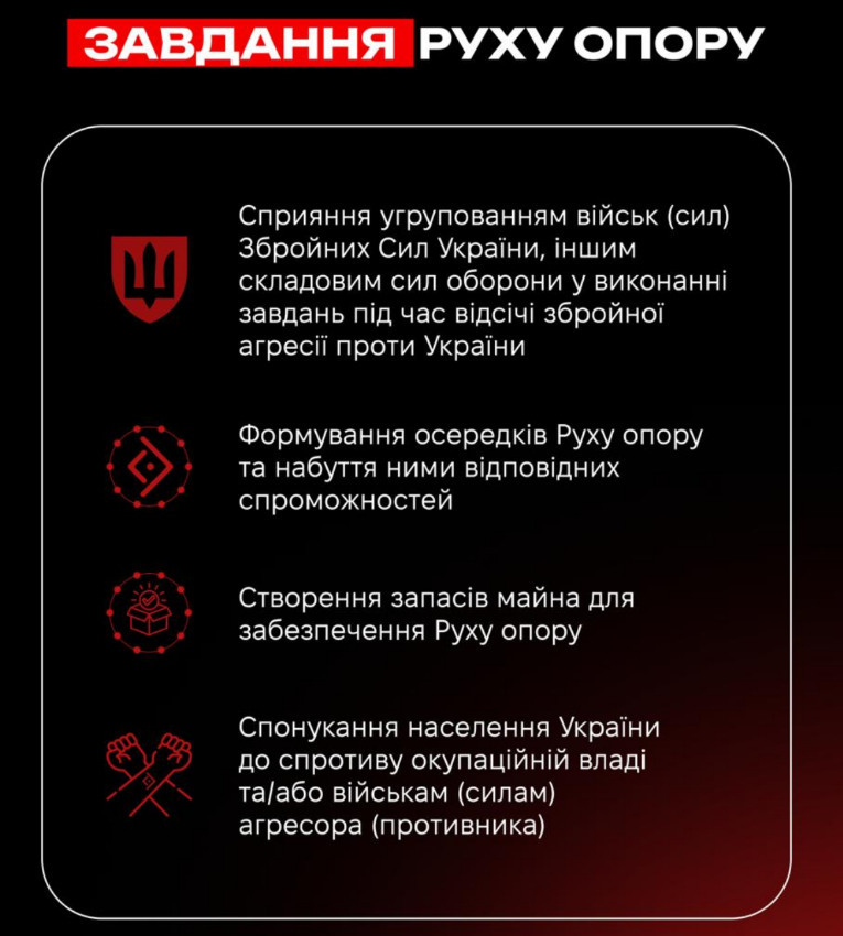 Правова рамка цього явища чітка: діяльність Руху опору визначена Законом України «Про основи національного спротиву». Йдеться про систему завдань, спрямованих на ослаблення ворога, підтримку Сил оборони, підготовку територій до спротиву, протидію окупаційним адміністраціям і використанню місцевих ресурсів агресором, а також про здобуття й аналітичне опрацювання розвідувальних відомостей. Важливо підкреслити: національний спротив — це не хаотичний протест, а структурована складова оборони держави.