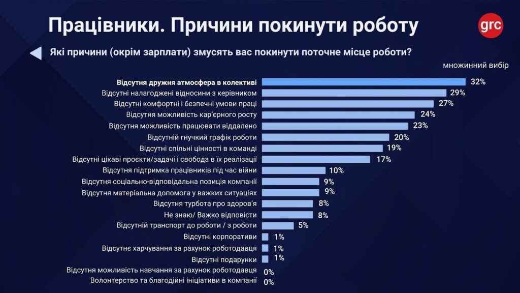 Втім гроші – не єдиний тригер незадоволеності. Дослідження показує, що все більшого значення набувають нематеріальні демотиватори, про які раніше говорили обережніше. Найпоширенішим демотиватором для працюючих українців є відсутність дружньої атмосфери в колективі. Про це говорять 32% опитаних. Майже третина респондентів зазначає важливість налагоджених взаємин з безпосереднім керівником, а 27% можуть покинути поточне місце роботи, якщо будуть відсутні комфортні та безпечні умови праці. Кожен четвертий українець буде шукати іншу роботу при недостатніх можливостях для кар’єрного зростання, а 23% зазначають критично важливою змогу працювати віддалено.