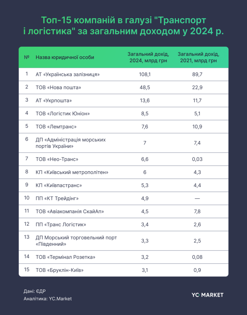 Першість із великим відривом утримує АТ «Українська залізниця», на рахунку якої 108,1 млрд грн загального доходу за 2024 рік (це на 20,5% більше, ніж у 2021 році – 89,7 млрд грн). «Укрзалізниця» – державний перевізник і власник залізничної інфраструктури, що забезпечує значну частину вантажообігу країни, особливо після переорієнтації експорту з морського транспорту на залізницю.