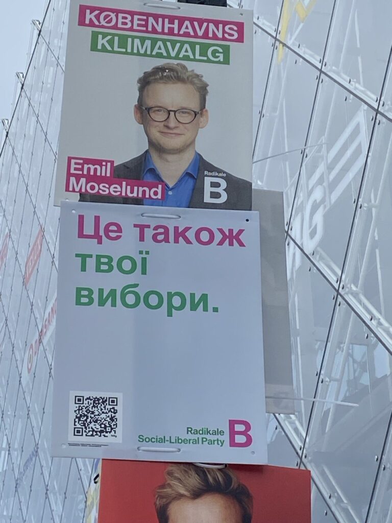 У різних куточках столиці можна побачити синьо-жовті прапори — на ратуші, у вітринах кав’ярень, на вікнах будівель. Для данців це вже не просто акт солідарності, а символ спільного майбутнього. Плакати з українськими гаслами, як-от «Це також твої вибори», стали частиною передвиборчого ландшафту. Це вперше в історії Данії, коли офіційна партія — соціал-ліберальна Radikale Venstre — вирішила звернутися до українців їхньою мовою.