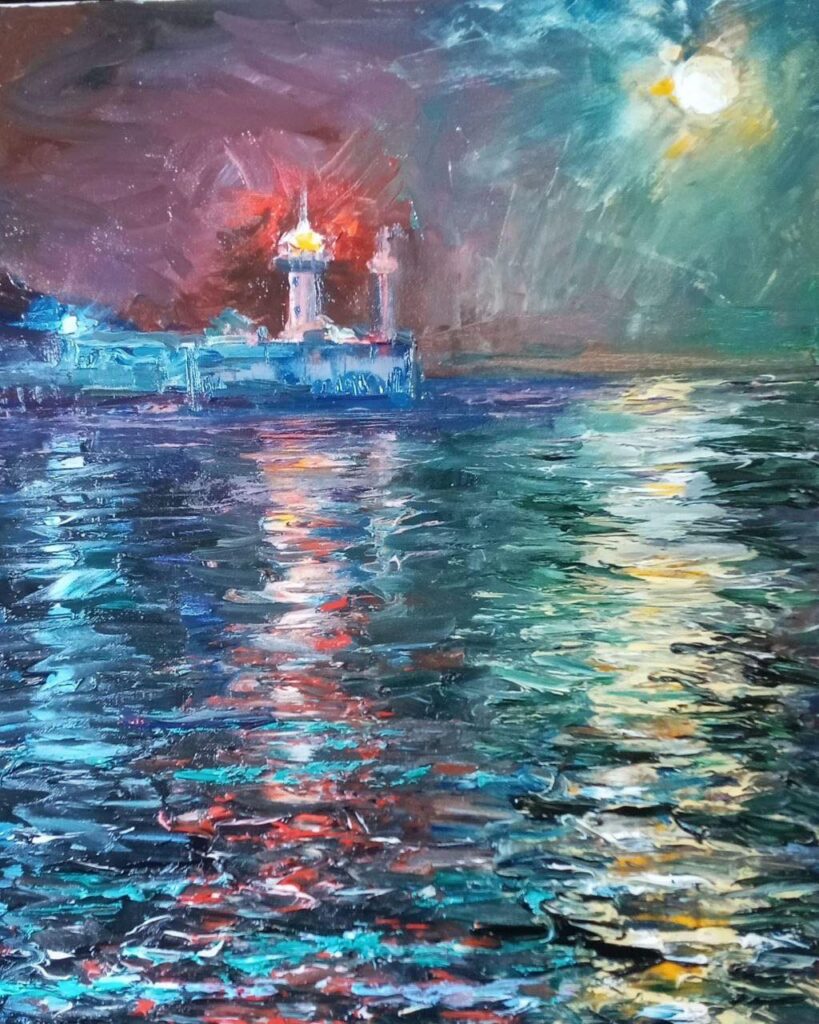 Її мазок живе власним життям: він густий, рельєфний, ніби вихоплений з бурі. Фарба лягає так, наче хвиля сама обрала напрям, а світло — власний шлях крізь темряву.