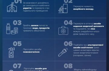 Зокрема, ДСНС рекомендує: по можливості дізнатися, де розташоване найближче укриття та перевірити стан підвального приміщення;перевірити наявність аварійного виходу;зробити запас питної та технічної води, продуктів тривалого зберігання;перевірити в аптечці засоби медичної допомоги та подумати, які ліки можуть знадобитися протягом тривалого часу.підготувати